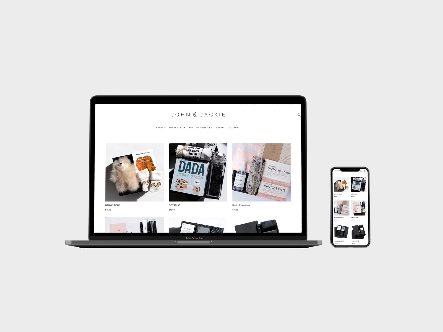 John & Jackie is a modern gifting studio that offers custom and curated gift boxes. I led branding strategy and design efforts to create a visual identity that synchronized masculine and feminine aesthetics consistently across digital platforms, print design, packaging, and editorial.